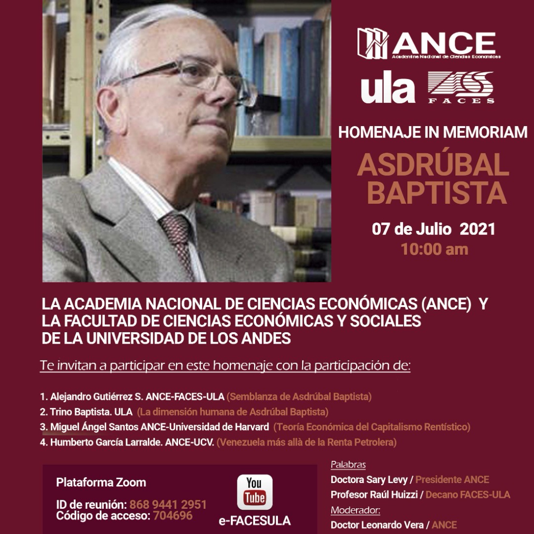 La Academia Nacional de Ciencias Económicas y de ULA FACES invitan al homenaje in memoriam al Dr. Asdrúbal Baptista. Miércoles 7 de julio, 10:00 am (Venezuela)